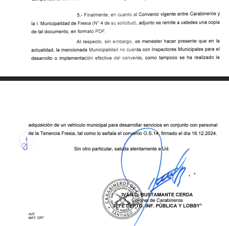 Finalmente, en relación con el convenio OS-14 suscrito el 16 de diciembre de 2024 entre la Municipalidad de Fresia y Carabineros de Chile, el documento establece la realización de patrullajes preventivos conjuntos entre inspectores municipales y personal policial, utilizando vehículos municipales para reforzar la seguridad en sectores apartados o con mayor percepción de inseguridad. Sin embargo, en la misma respuesta a Fresia Ahora, Carabineros aclara que, a la fecha, la Municipalidad no cuenta con inspectores municipales ni con el vehículo comprometido para cumplir el objetivo del convenio, por lo que las acciones previstas en ese convenio no se han podido implementar de manera efectiva, pese a que el instrumento sigue vigente.