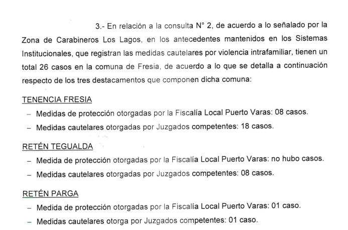 Respecto de las medidas de protección y cautelares, Carabineros informó a Fresia Ahora que, de acuerdo con sus sistemas institucionales, existen 26 casos con medidas vigentes en la comuna de Fresia en lo que va del año, derivadas de denuncias por violencia intrafamiliar. La institución detalla que dichas medidas se distribuyen entre la Tenencia de Fresia y los Retenes de Tegualda y Parga, combinando resoluciones de la Fiscalía Local de Puerto Varas y de los juzgados competentes. Estas medidas –que pueden incluir prohibición de acercarse a la víctima, órdenes de abandono del hogar u otras disposiciones judiciales– son una señal de que hay procesos en curso orientados a la protección, aunque numéricamente representan solo una parte de todos los casos registrados.