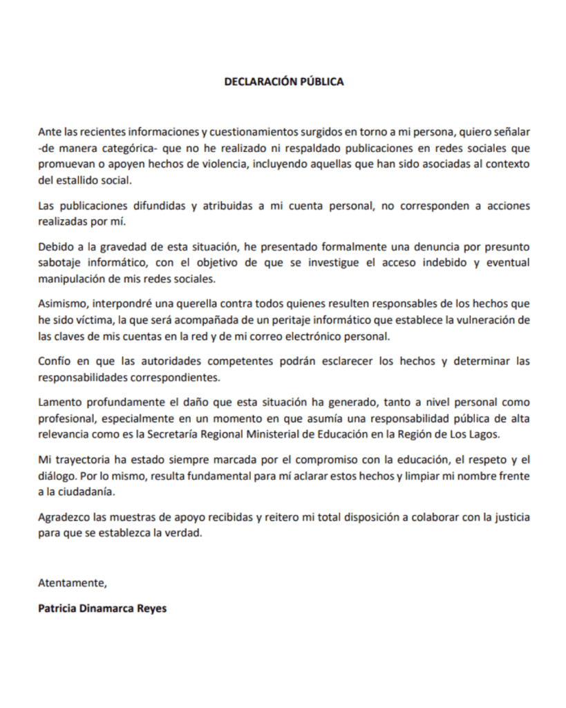 La ex nominada a Secretaria Regional Ministerial (Seremi) de Educación en la Región de Los Lagos, Patricia Dinamarca Reyes, emitió una declaración pública en la que negó categóricamente haber realizado o respaldado publicaciones en redes sociales que promuevan hechos de violencia, luego de que circularan contenidos atribuidos a su cuenta personal vinculados al contexto del estallido social.