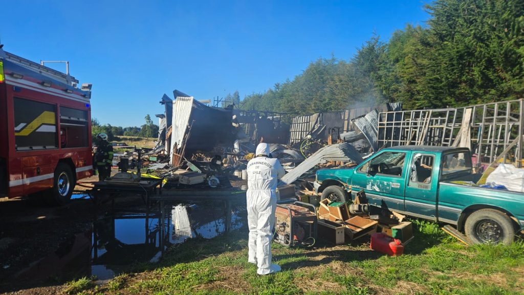 Detectives del Laboratorio de Criminalística de Carabineros (LABOCAR), por instrucción de la Fiscalía, se trasladaron hasta un predio ubicado en la ruta V-460, a la altura del Cruce La Paloma, en la comuna de Los Muermos, región de Los Lagos, para investigar un incendio que afectó a galpones destinados a labores de cosecha apícola.
