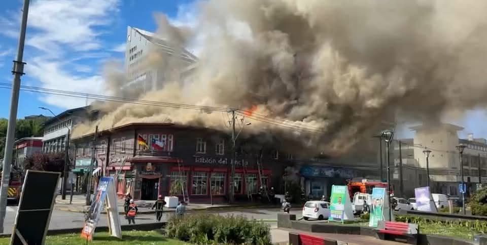 PUERTO MONTT, EL GONG.- El incendio afectó al tradicional restaurante El Tablón del Ancla, en pleno centro de Puerto Montt, una de las construcciones más emblemáticas y antiguas del borde costero. La emergencia movilizó a ocho compañías de bomberos que trabajaron de manera coordinada con Carabineros, SENAPRED, SAMU, SAESA, Suralis y el Municipio de Puerto Montt.