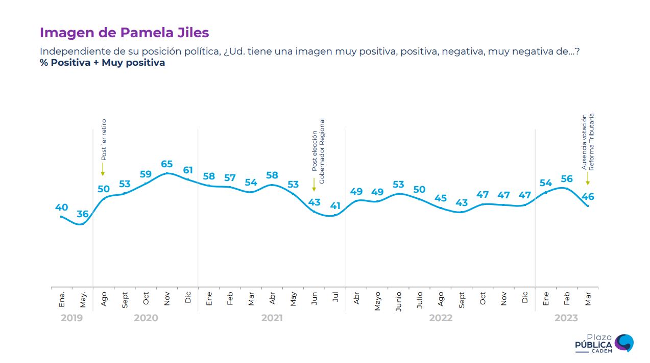 Un caso muy llamativo es el de Pamela Jiles, ya que la diputada del Partido Humanista bajó de 56 a 46%, hecho que estuvo marcado por su ausencia en la votación de la Reforma Tributaria, la que se realizó el miércoles 8 de marzo.