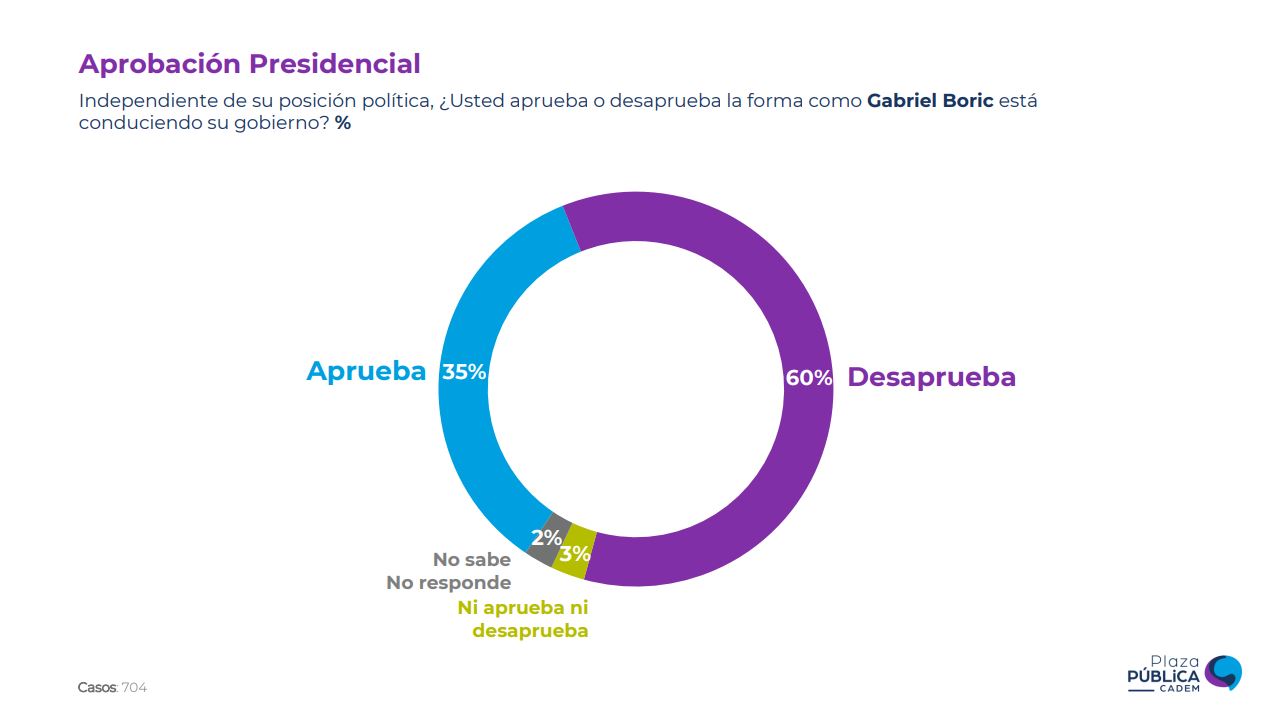 Ante la interrogante: «Independiente de su posición política, ¿Usted aprueba o desaprueba la forma como Gabriel Boric está conduciendo su gobierno?», un 60% de los encuestados desaprueba la gestión del Mandatario, mientras que un 35% la aprueba. Además, un 3% no la aprueba ni la desaprueba, y un 2% no sabe o no responde.