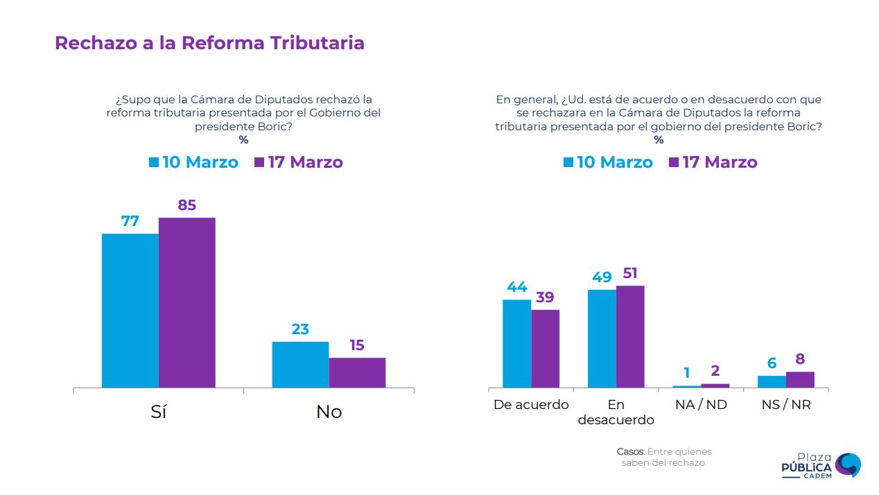 Frente a la consulta: «En general, ¿Ud. está de acuerdo o en desacuerdo con que se rechazara en la Cámara de Diputados la reforma tributaria presentada por el gobierno del presidente Boric?», un 51% de los encuestados está en desacuerdo, mientras que un 39% está de acuerdo.