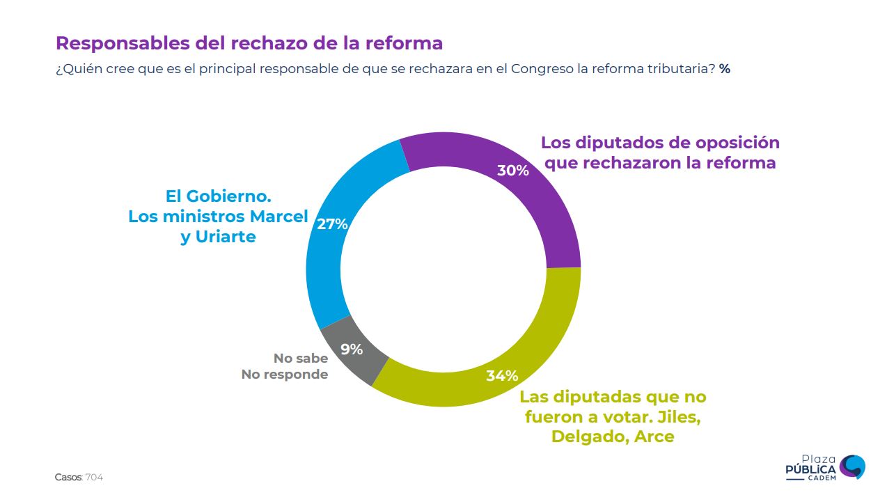 Ante la pregunta: «¿Quién cree que es el principal responsable de que se rechazara en el Congreso la reforma tributaria?», un 34% de los encuestados manifestaron: «Las diputadas que no fueron a votar. Jiles, Delgado, Arce».