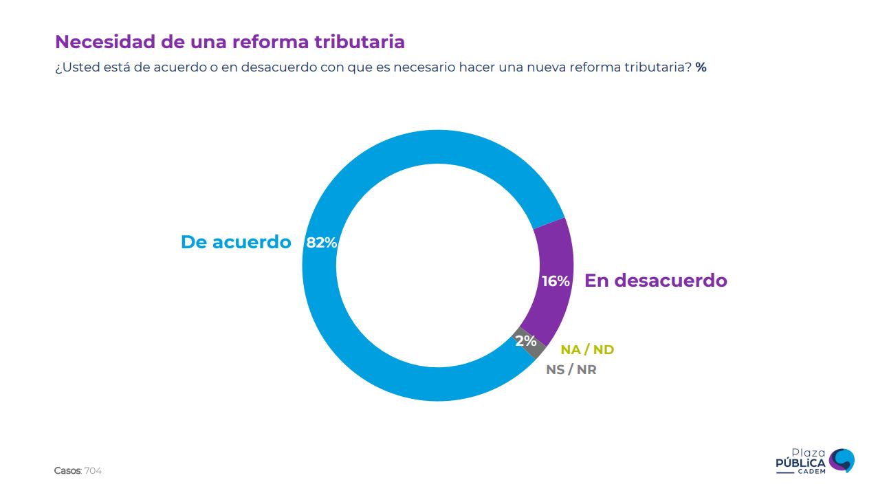 Frente a la consulta: «¿Usted está de acuerdo o en desacuerdo con que es necesario hacer una nueva reforma tributaria?», un 82% manifestó estar de acuerdo, un 16% en desacuerdo y un 2% no sabe o no responde.