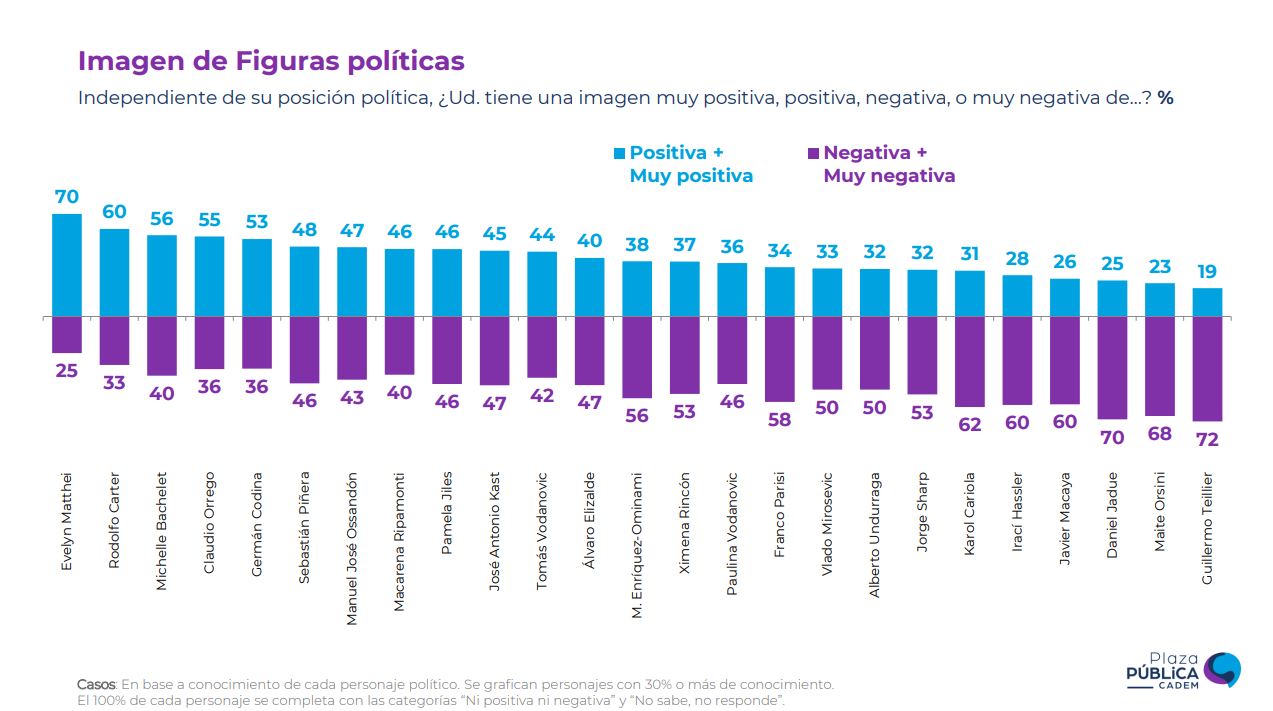 En contrapartida, los peores evaluados son el presidente del PC, Guillermo Teillier, con un 72% de desaprobación, el alcalde de Recoleta, Daniel Jadue (70%); y la diputada Maite Orsini (68%).
