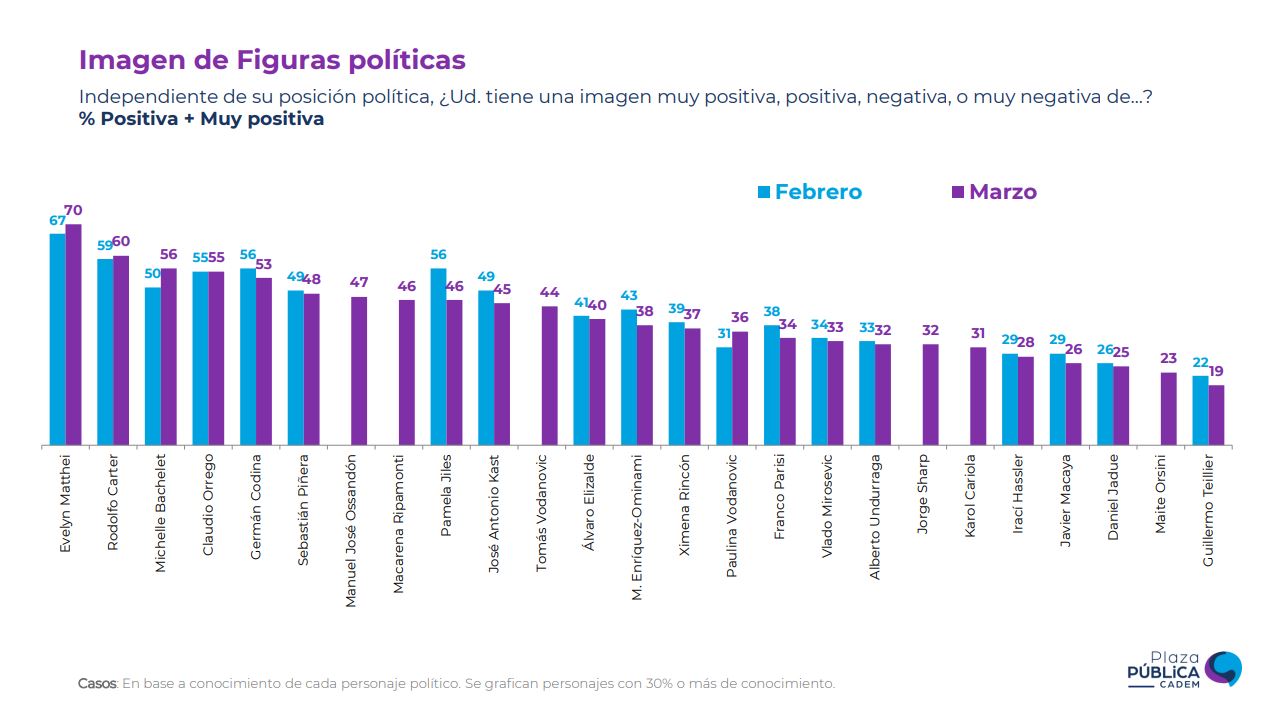 Evelyn Matthei, por su parte, subió desde un 67% de aprobación en febrero hasta el actual 70%. Carter subió un punto, de 59% a 60% y Michelle Bachelet subió seis puntos, de 50% a 56% en marzo.